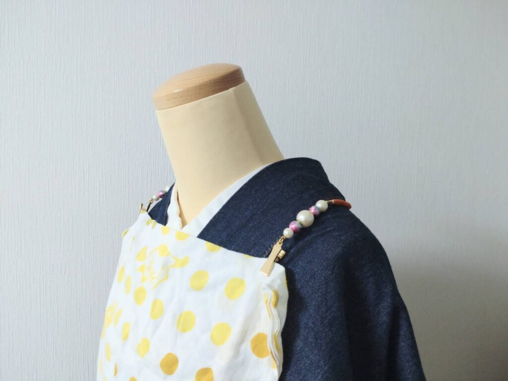 衿元や帯に挟み込んでもOKですが、よりしっかり着物したい方はタスキットを使うのがおすすめ。タスキットはたすき掛けの代わりに着物の袖を留めるのが基本機能ですが、ハンカチや手ぬぐいを挟んで首からかければ、汚れ防止のエプロン代わりになります。